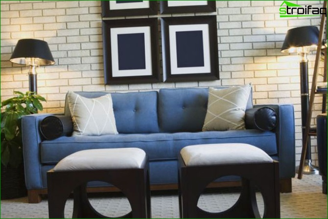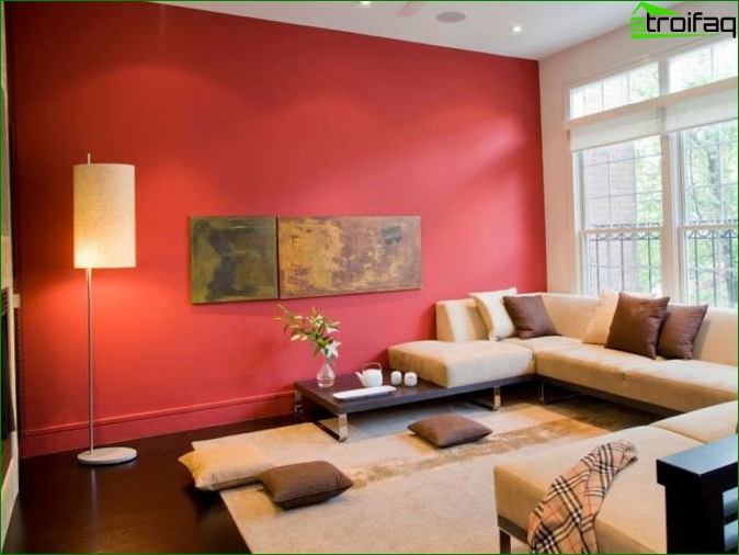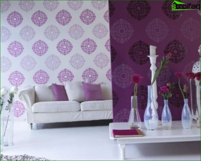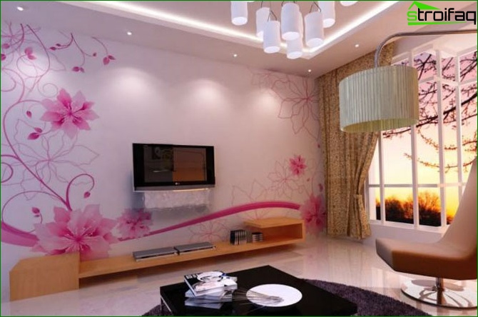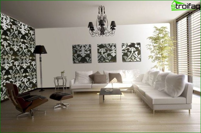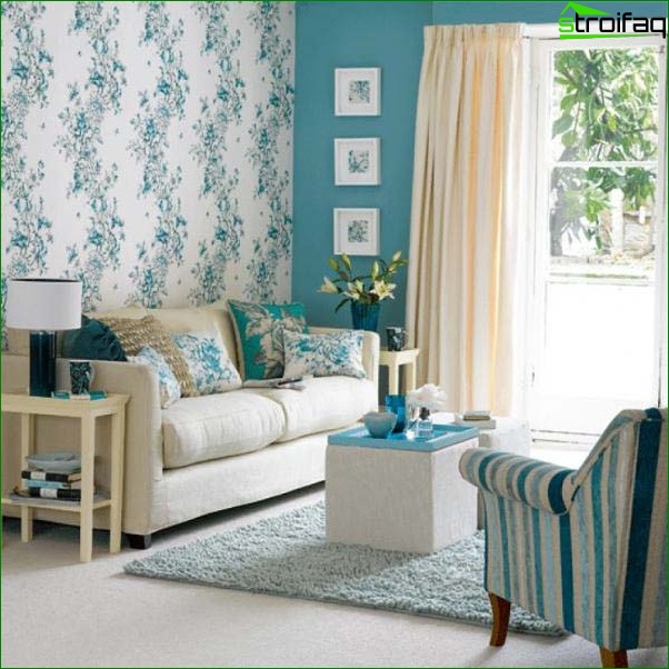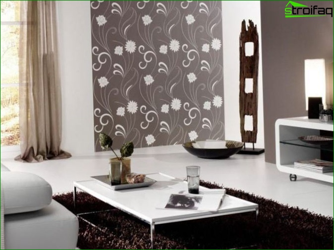 Pour ce faire, vous devez effectuer une transition en douceur d’une couleur à l’autre, ou en collant la partie supérieure des murs du salon avec du papier peint clair et le fond - saturé. De là, votre chambre ne fera que devenir plus confortable. Il ne sera pas moins impressionnant lorsque trois murs sont collés avec le même papier peint, et le quatrième agit comme un accent lumineux (papier peint photo, par exemple).