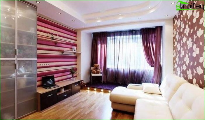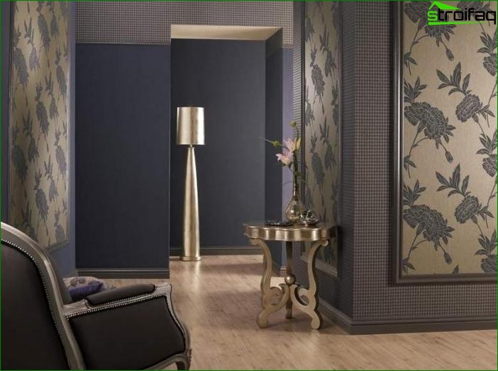 | Avec différents motifs | La forme de combinaison la plus complexe. Habituellement, deux types de papier peint sont pris avec un motif différent, mais en accord avec la couleur d’arrière-plan. Le plus souvent, ils utilisent la géométrie en combinaison avec l’abstraction, un ornement floral avec une bande |