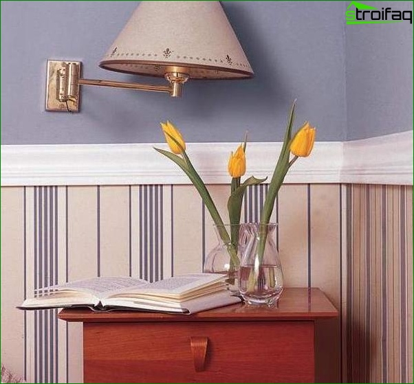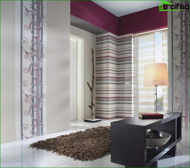 | Division horizontale | Fond d’écran à rayures, haut - dans un petit motif; Bas - motif uni ou petit, rayures supérieures, grand motif; Bas - grand dessin, haut - uni |