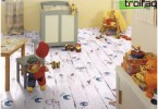 Il est préférable que le sol de votre pépinière soit en bois et qu’il soit recouvert de mastic naturel à base de cire d’abeille ou de gomme. Au lieu de papier peint en vinyle, choisissez du papier: ils «respirent» mieux et ne les collent qu’avec de la pâte ou de la colle spéciale. Pour la peinture murale, utilisez également uniquement des peintures certifiées pour une utilisation dans les garderies..